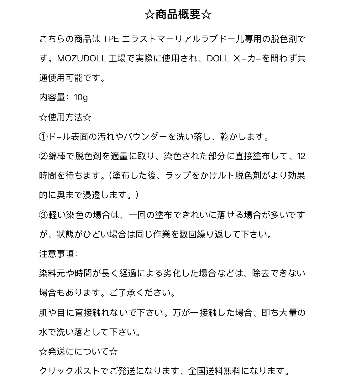 メンテナンス用品 専用脱色剤 シリコン製tpe製ドールも通用